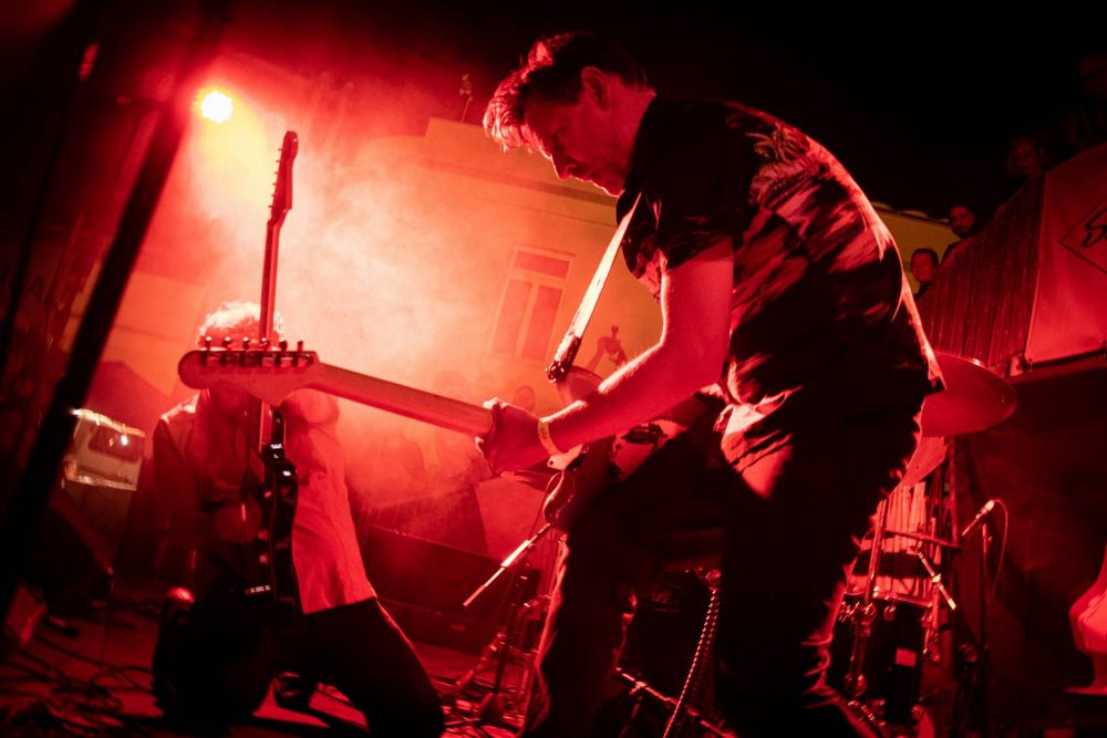 So what exactly is it about that sound? I mean, it's not that far removed from the rest of surf, with plenty of reverb but basically nada as far as drip. It has a sort of Western rattle and twang to it, but there's only a handful of overtly Western songs. And whatever the opposite of "lush" is, it's that. It feels harsh, sparse, and MEAN. They perform with lights out aside from a strong red, filled with smoke that paints them in a monotone, and I think it's the PERFECT visual complement. But it's also wild and raucous -- plenty of bands can simply create a mood and lurk in it, it's another to make action.