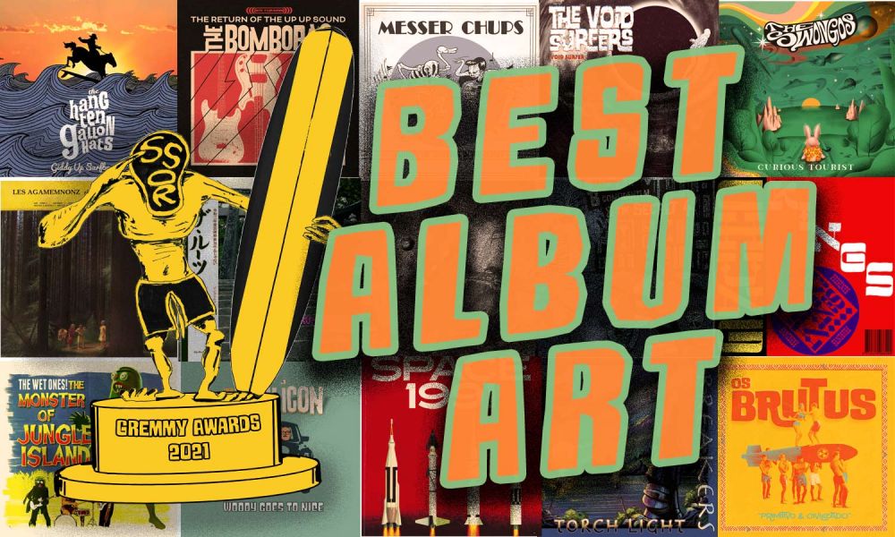 To talk about this album art is to speak parallel to the music itself, walking a confounding line between lampoon and sincerity. There's a thick, inescapable mood in this stunningly professionally painted tall forest surrounding the band, with the members both dwarved by natural elements and standing out strikingly by contrast. But in case you're lost in that mood, make sure to appreciate the humor; Les Agamemnonz' togas are pretty funny (they're pictured here in their performing garb), and in case you can't appreciate that they have one member clutching his feet, punished for staying barefoot in this landscape. Another subtle humorous contradiction is in the layout, with the solid yellow bar mimicking classical LPs, particularly Deutsche Grammophon, not only announcing a surf group with more dignity than traditionally ascribed, but sabotaged by the title of the album "Amateurs". Beautiful and playful, that's Amateurs, that's Les Ag.