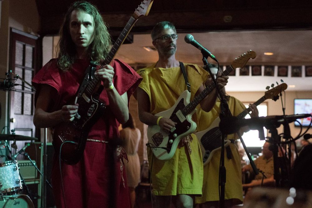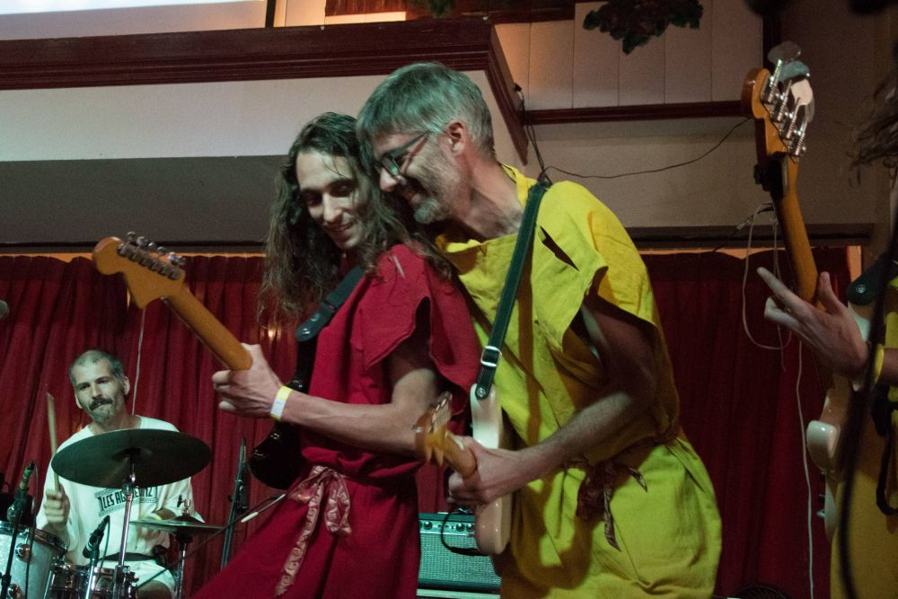 This was before I knew anything about them live, and the landscape-focused packaging of their albums gave few cues. Within a few minutes I had decided: if I could join any band performing at this convention, it would be these guys. They come onstage wearing different colored togas (in the drummer’s case, just a way-too-big T-shirt) and barefoot and jump around in an aimless, careless manner that really just broadcasts that they’re into what they’re doing, and I was into it too. It wasn’t all aimless -- there were some synchronized guitarist formations and rotations reminding me of those videos of the Spotnicks, but then there was also a guitarist seated at the side of the stage while his bandmate solos. Really, they just looked like they were having fun.